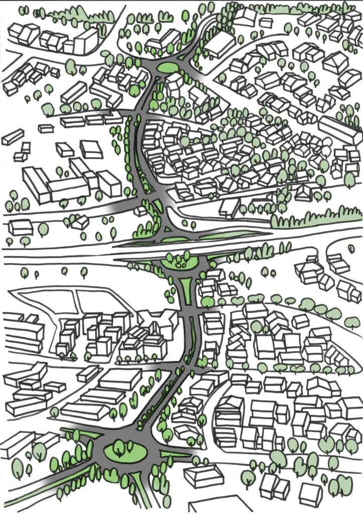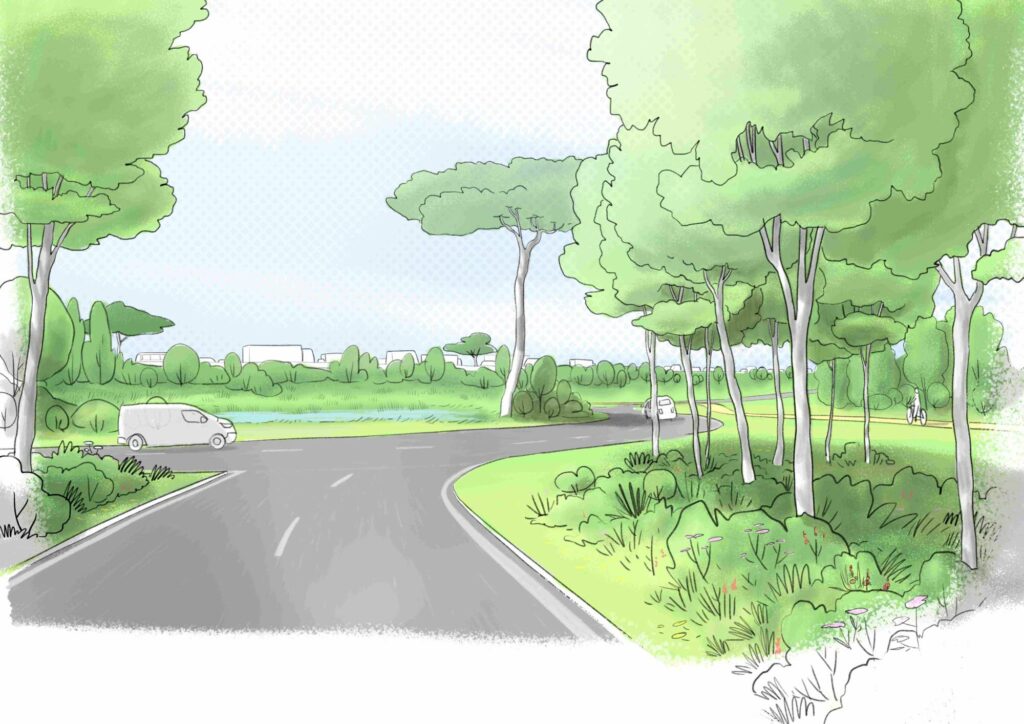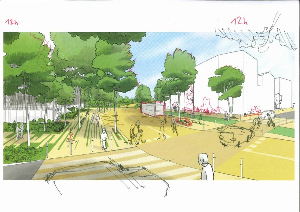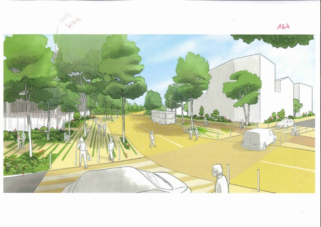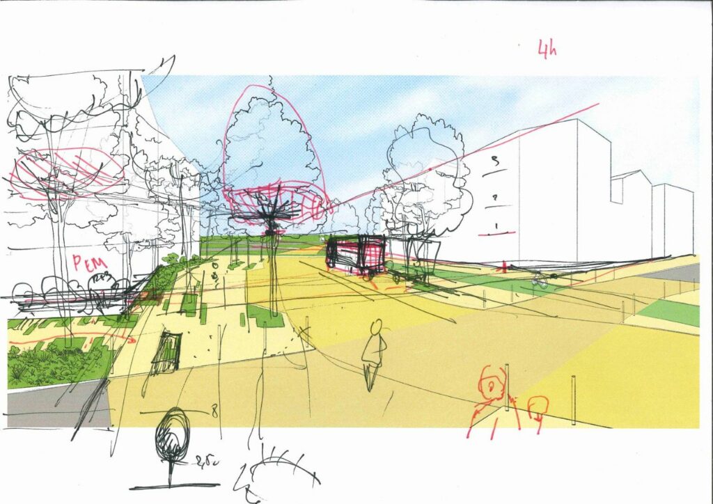 Graphiquement les perspectives proposent une synthèse des vues existantes ou modélisées numériquement avec un style qui s’approche de la narration graphique ou du croquis.