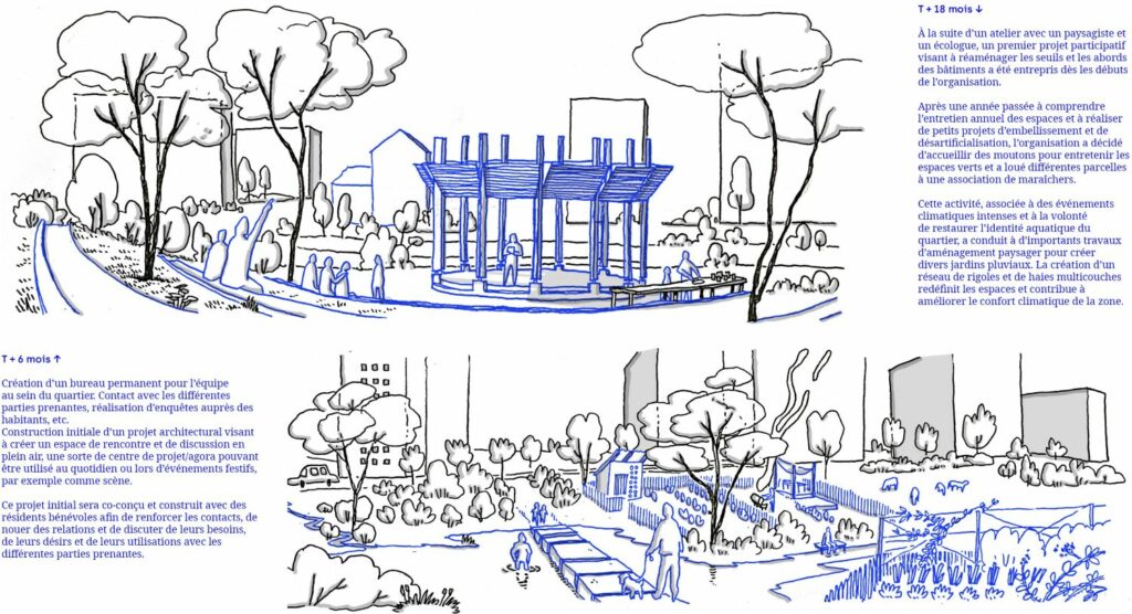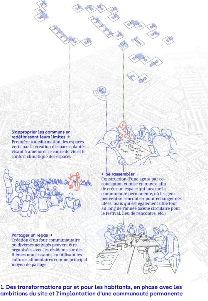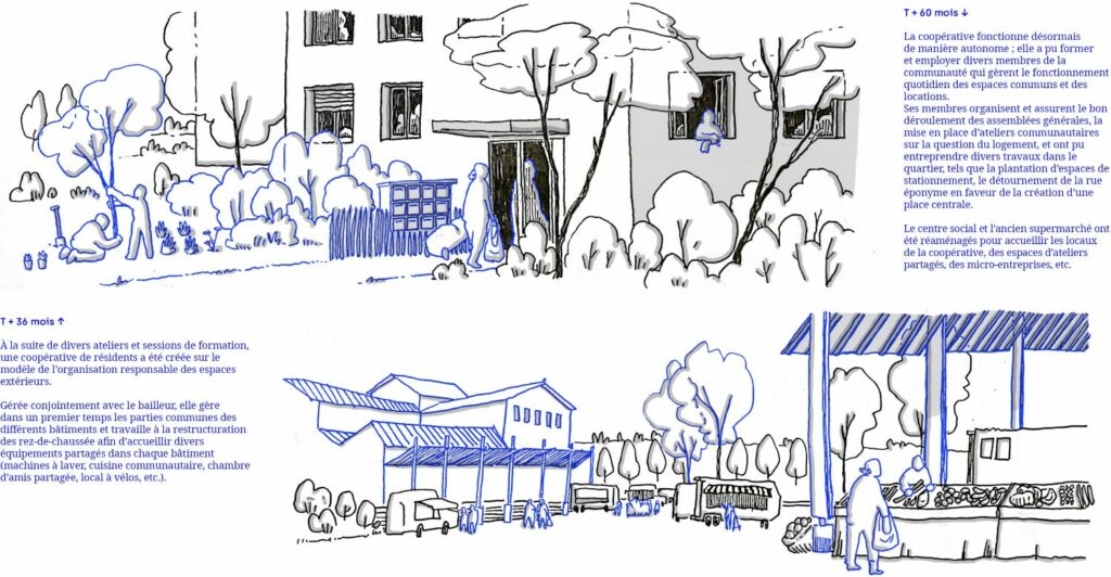 Ce projet, qui s’inscrit dans une démarche à long terme formalisée par le travail continu de la communauté, ne peut aboutir à un scénario détaillé et définitif. Par conséquent, la cartographie des parties prenantes, l’analyse des données pour comprendre la dynamique des résidents, la volonté de créer les conditions de l’autodétermination des résidents et la transformation du rôle du propriétaire en celui d’un coopérateur, jettent les bases d’un projet à long terme, dont l’orientation sera déterminée à mesure que la communauté deviendra plus permanente.